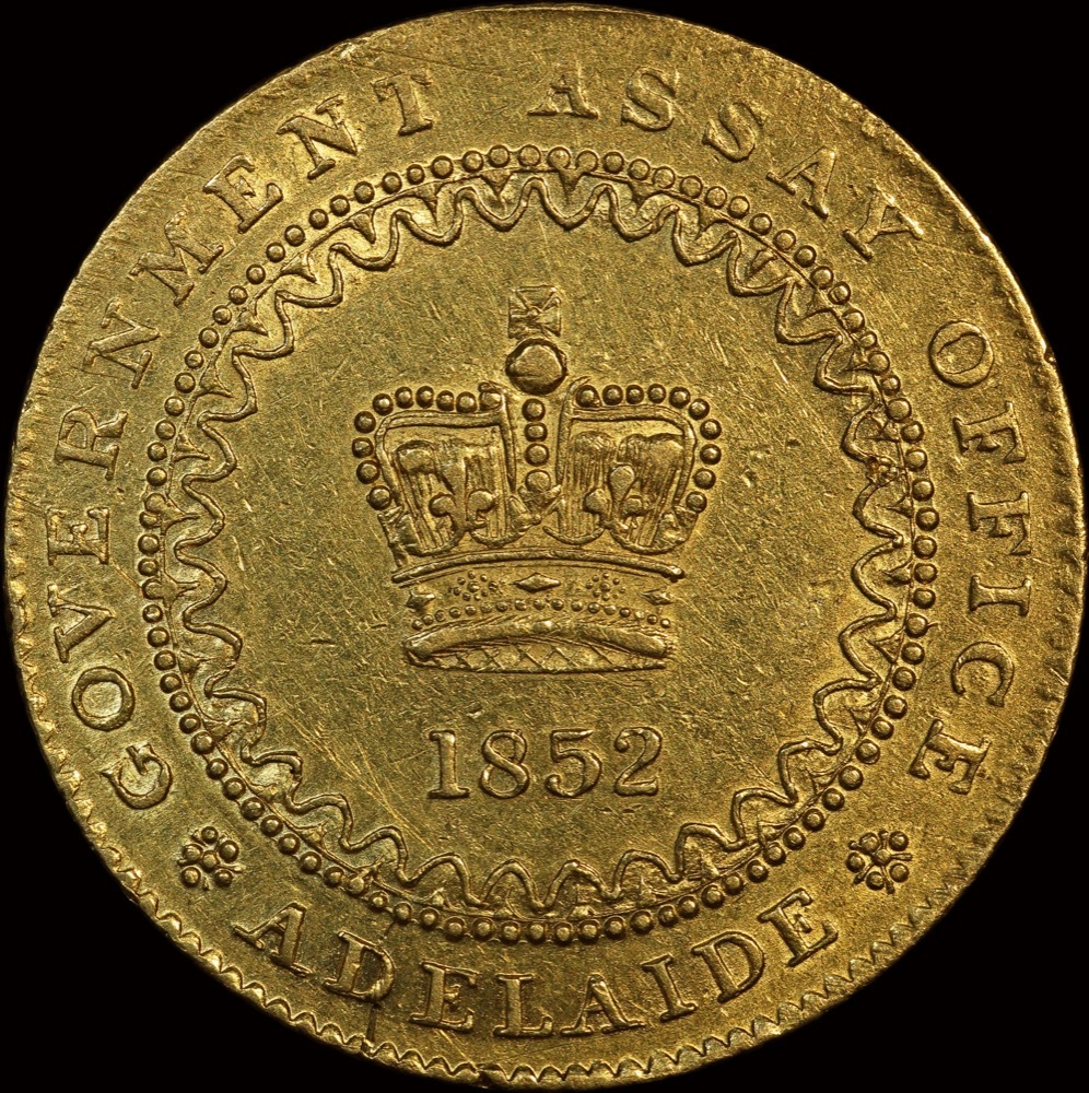 The 1852 Adelaide Pound is Australia's first unofficial gold coin, minted in response to the discovery of gold at Mount Alexander (Victoria) in November 1851.Varying reports suggest that up to 80% of the adult male population of Adelaide decamped to the goldfields, taking all of the hard currency they could find and allowing the colony to fall into disrepair.According to the noted authority on the topic, J. Hunt Deacon “The introduction of the Bullion Act and the subsequent coinage of the Adelaide Pound was a masterly stroke of legislature, and played no small part in averting economic catastrophe and laying the foundation for a stabilised currency.”, The Adelaide Pound remains to this day as solid testament to Australian ingenuity during a period of social and economic turmoil.Their appeal to historians and collectors is heightened further when their rarity and beauty in superior grade is considered.