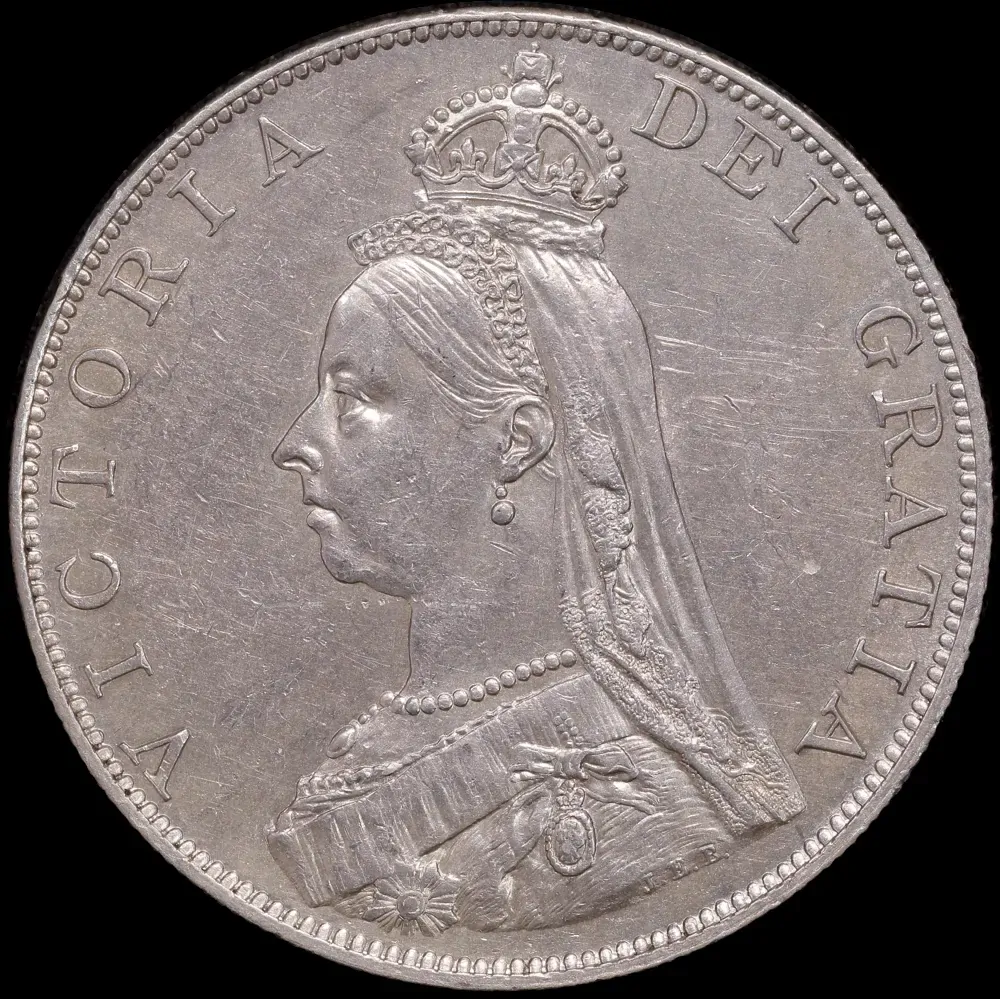 Obverse: Jubilee crowned and veiled bust of Queen Victoria facing left, designed by Sir Joseph Boehm; legend reads “VICTORIA D:G: BRITT: REG: F:D:”