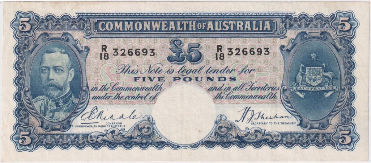 1939 Five Pound Sheehan/McFarlane R45 about EF 1939 Five Pound Sheehan/McFarlane R45 about EF 1939 Five Pound Sheehan/McFarlane R45 about EF $172.50