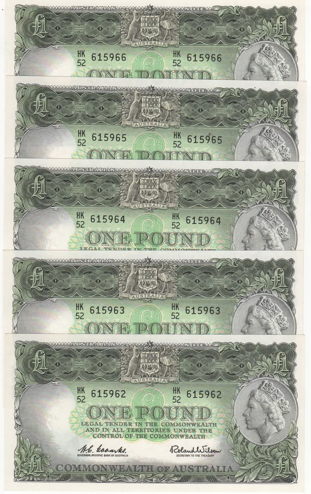 1961 One Pound Consecutive Run of 5 Coombs/Wilson R34B Uncirculated