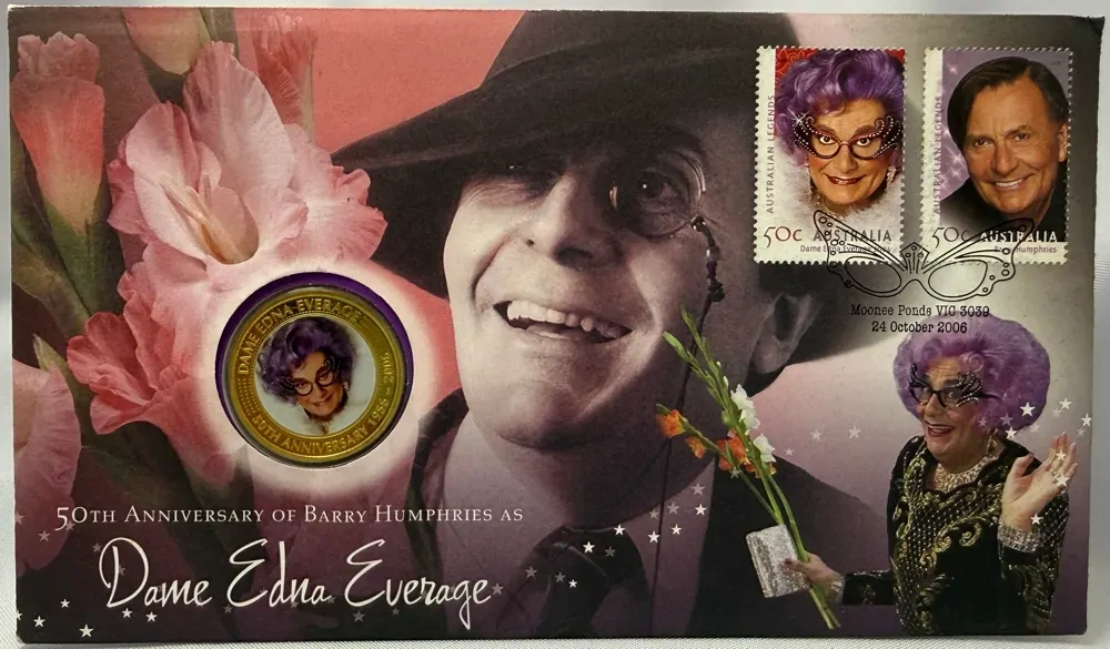 This PNC issue marks 50 years of satirist and actor Barry Humphries AO in his alter ego as Dame Edna Everage.