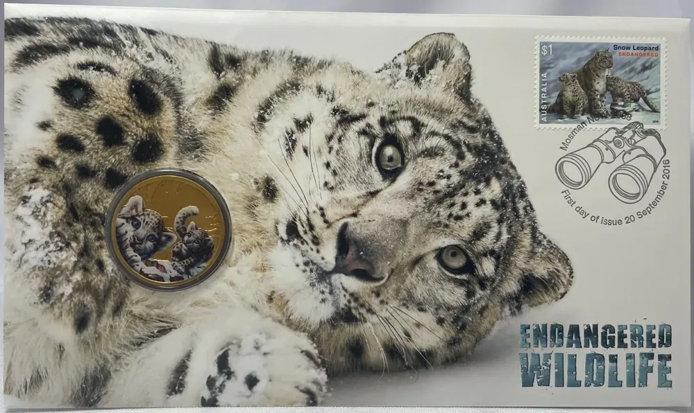 This PNC highlights the vulnerable status of the snow leopard and is part of a sought-after modern collectible series.