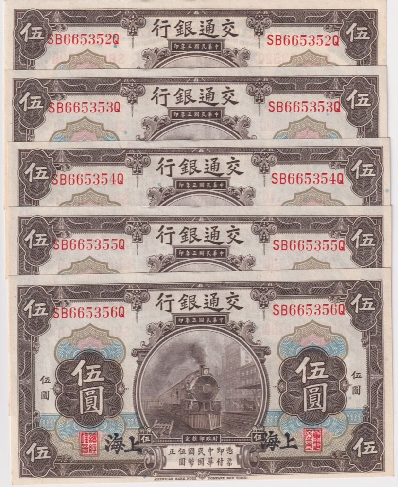 China (Bank of Communications) 1914 Consecutive Run of 5 - 5 Yuan P# 117n Uncirculated