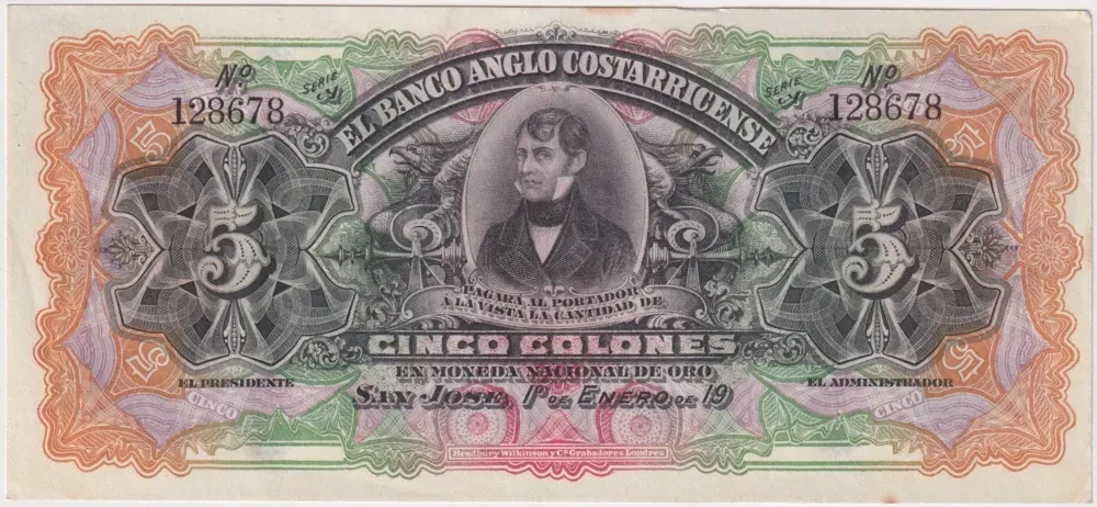 Front Design: Black on multicolour underprint with a central oval portrait of Juan Mora Fernández, the first Head of State of Costa Rica, titled EL BANCO ANGLO COSTARRICENSE above. Ornate guilloche panels at left and right each contain the denomination “5” with finely engraved scrollwork and the text promising payment of five colones in national gold currency along the lower centre.