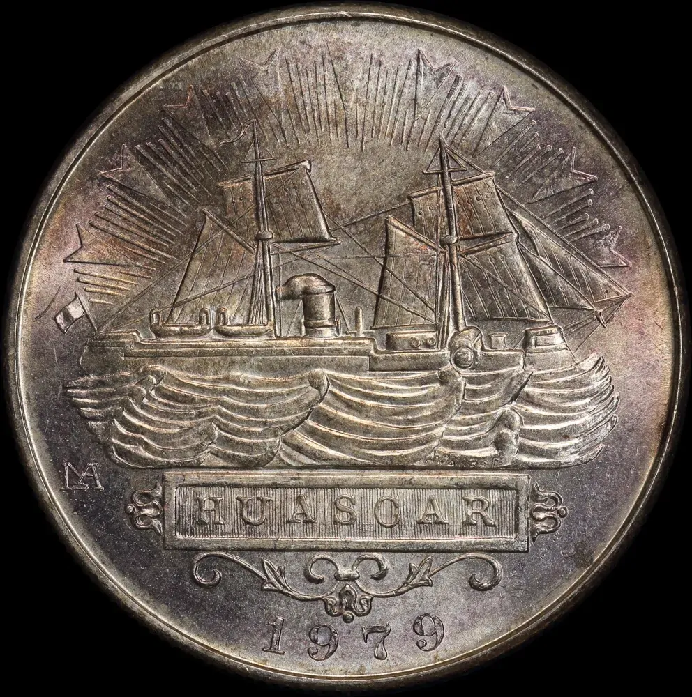 Reverse: Depicts the Peruvian ironclad warship Huáscar sailing at sea, with the denomination and date below, commemorating the centenary of the Battle of Iquique during the War of the Pacific.
