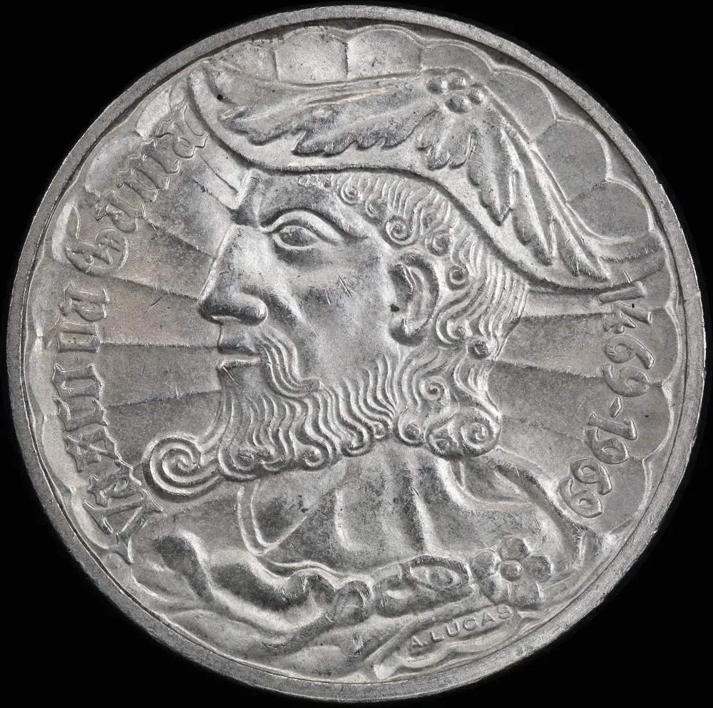 This commemorative coin marks the 500th Anniversary of birth of Vasco da Gama, a prominent Portuguese explorer.