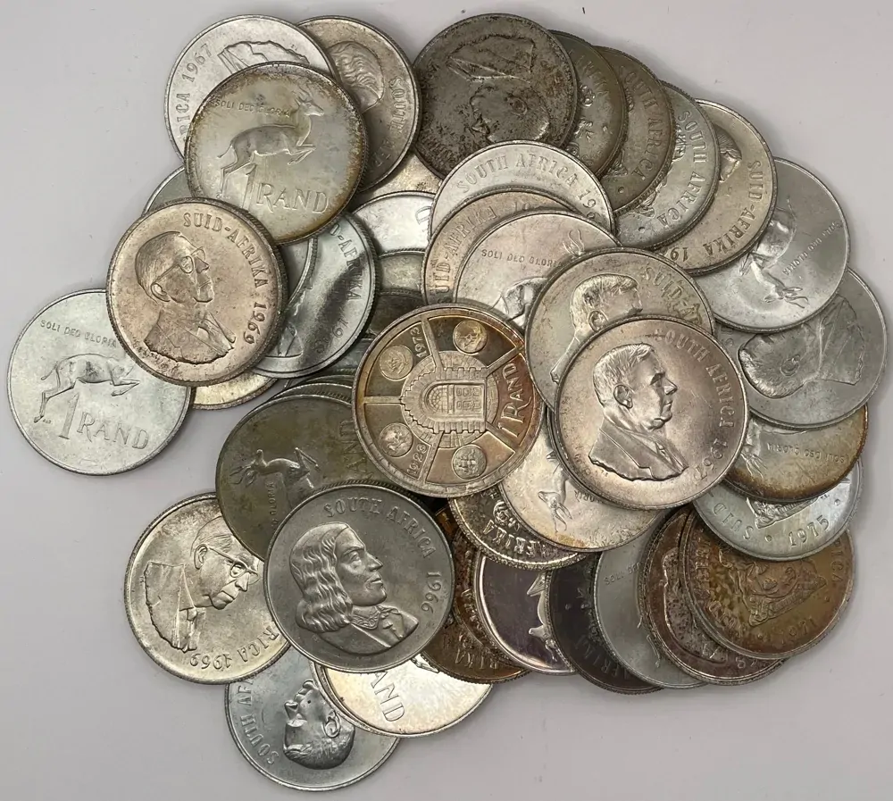 This bag includes 50 silver South African 1 Rand coins, mixed dates, grades, and designs.