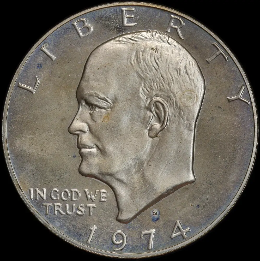 Obverse: Shows a left-facing portrait of President Dwight D. Eisenhower, designed by Frank Gasparro, with the inscription LIBERTY above, IN GOD WE TRUST to the left of the portrait, and the date 1974 below.